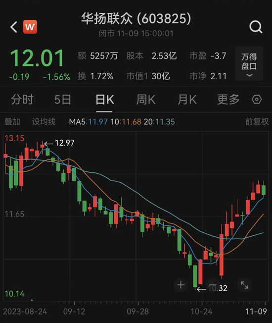 11月9日收盘,华扬联众每股报12.01元,跌幅1.56%,最新市值30亿元。