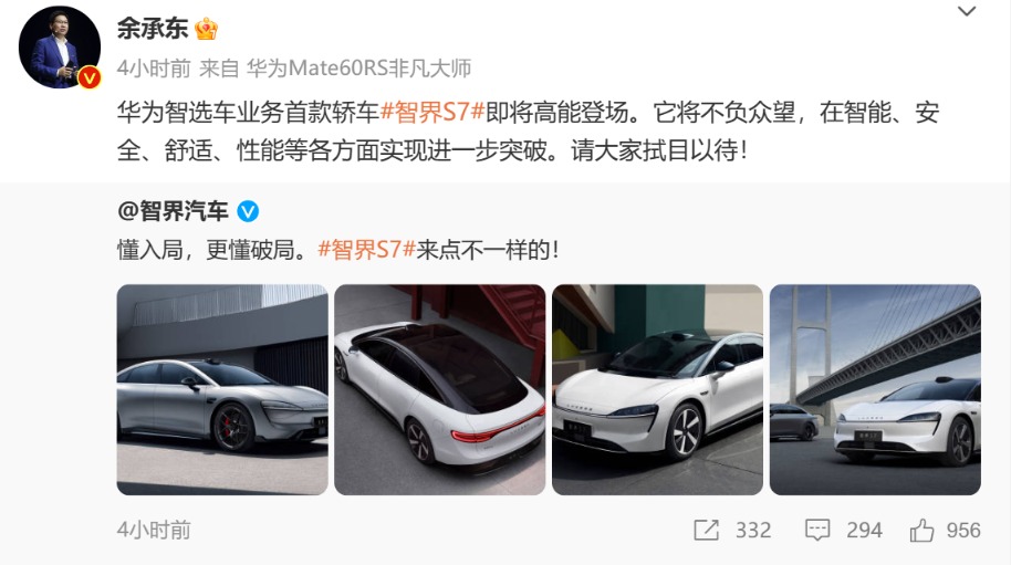 随后,华为常务董事、终端BG CEO、智能汽车解决方案BU董事长余承东发布微博表示:智界S7即将高能登场,它将不负众望,在智能、安全、舒适、性能等各方面实现进一步突破。请大家拭目以待!