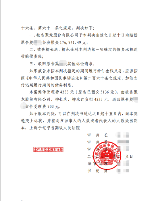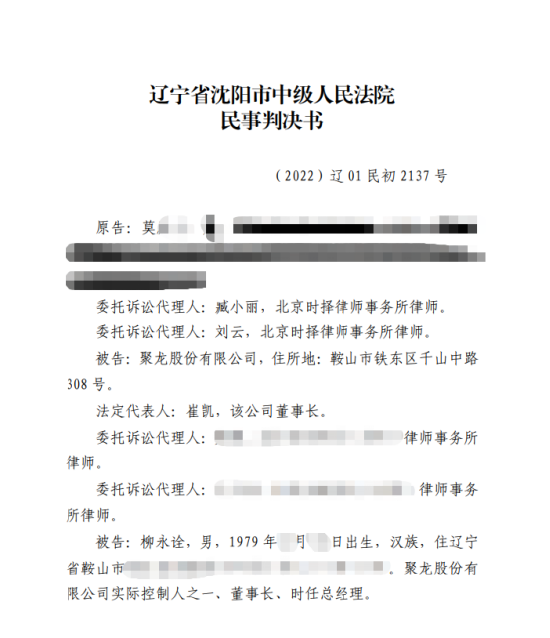 北京时择律师事务所臧小丽律师透露,最近收到一批投资者起诉聚龙股份、柳长庆、柳永诠等被告证券虚假陈述责任纠纷案件的《民事判决书》,沈阳中院一审判决投资者胜诉,聚龙股份需向原告承担金额不等的赔偿责任,柳长庆、柳永诠父子承担连带责任。其中仅原告莫某一人,法院一审判决支持的金额约17.7万元。(聚龙退维权入口)