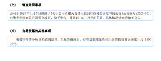 聚龙退在2022年年报及2023年半年报中披露,已有众多投资者提起证券虚假陈述责任诉讼,累计起诉金额约1300万元,聚龙退对这批案件,确认计提负债1300万余元。