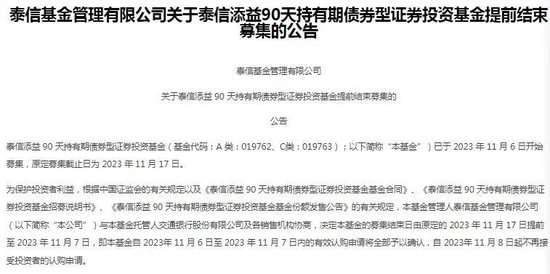 泰信基金公告显示,2023年11月6日至2023年11月7日内的有效认购申请将全部予以确认,但11月8日起,该基金就不再接受认购申请。