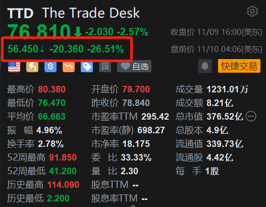 在线广告公司The Trade Desk盘前跌26.36%,报56.58美元。消息上,公司第三季度收入为4.93亿美元,高于去年同期的3.95亿美元,同比增长25%。但该公司的前景远低于华尔街的预期。Trade Desk预计,第四季度收入 “至少为5.8亿美元”,远低于共识的6.1亿美元,并表明增长减速至18%。