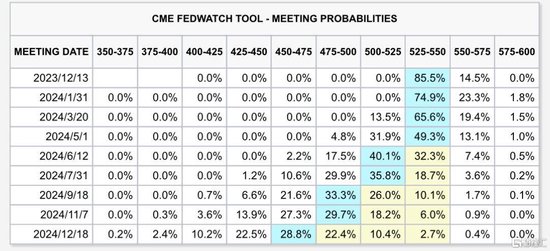 据CME数据显示,美联储12月维持利率在5.25%-5.50%区间不变的概率为85.5%,加息25个基点至5.50%-5.75%区间的概率为14.5%。