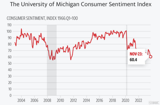 周五,密歇根大学发布报告称,美国11月消费者信心指数的初步读数从10月份的63.8下降至60.4,连续第四个月下降,是5月份以来的最低水平。