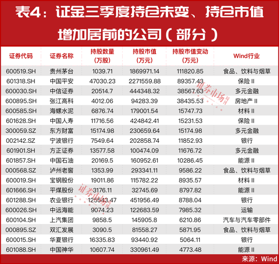 汇金与证金的操盘如出一辙,从三季报来看,两者对不少公司均为“联手布局”。据不完全统计显示,三季度,中央汇金资产管理有限责任公司共现身151只个股前十大流通股股东名单,合计持仓市值为1703.51亿元,对绝大多数个股的持仓数量同样均未发生变化,而在持股未变的情况下,其持仓贵州茅台、海螺水泥、东方财富、宁波银行、平煤股份等多家公司的市值均出现了可观增长(见表4)。