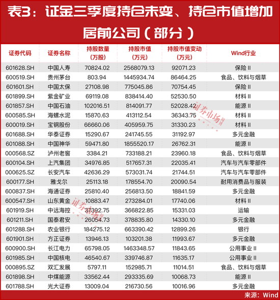 整体来看,对证金增厚市值较多的公司多为金融、食品饮料、材料、汽车等领域的相关“大块头”。如保险领域的中国人寿、中国太保;食品饮料中的贵州茅台;材料类的紫金矿业、海螺水泥、中国铝业等,在证金三季度持仓未变的情况下,持仓市值增加金额均超过了3亿元。另外,持仓的能源公司中国神华、汽车公司上汽集团等持仓市值增加金额同样较高,均超过了1亿元(见表3)。