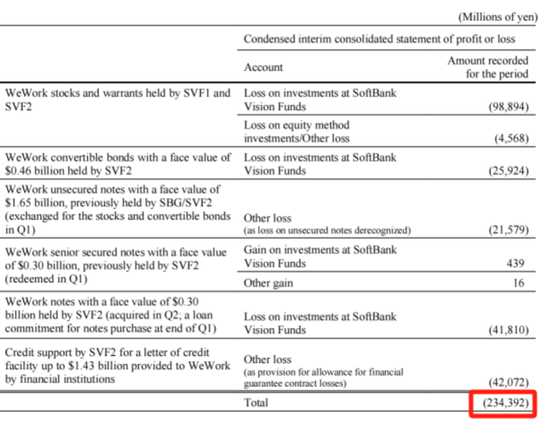 财报显示,上半财年(4月至9月),软银愿景基金一期和软银愿景基金二期因投资和财务支持WeWork共损失2344亿日元(约合112.73亿元人民币)。软银愿景基金二期自成立以来,亏损达207亿美元。