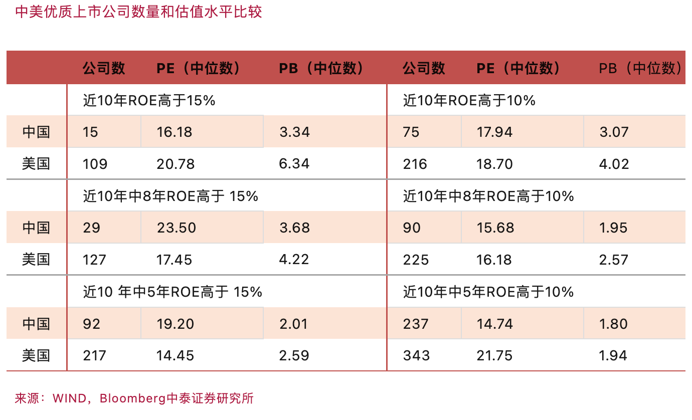 其次,即便统计ROE连续10年超过10%的公司数量,中国也只有美国的三分之一。