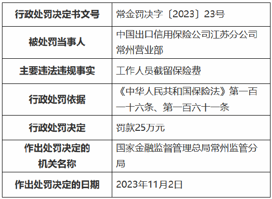 11月13日金融一线消息,国家金融监督管理总局常州监管分局行政处罚信息公开表显示,中国出口信用保险公司江苏分公司常州营业部因工作人员截留保险费,被罚款25万元。