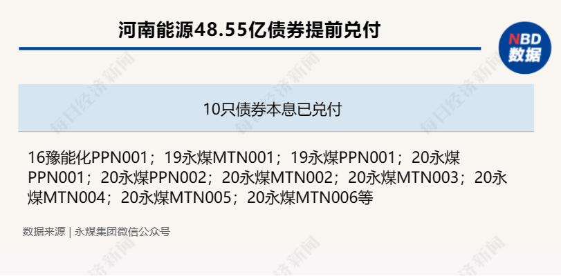 11月10日,永城煤电控股集团有限公司(下称“永煤集团”)在微信公众号发文称,河南能源集团有限公司(下称“河南能源”)48.55亿债券提前兑付,本次10只债券兑付完成后,河南能源旗下存续债券已全部兑付完毕。