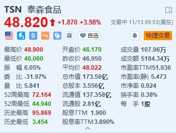 泰森食品(TSN.US)涨近4%,报48.82美元。泰森食品公布第四财季业绩,销售额为133.5亿美元,同比下降2.83%,低于市场预期的137.3亿美元;每股收益为0.37美元,同比下降77.3%,但高于市场预期的0.29美元。公司预计2024财年销售额与2023财年的528.8亿美元持平。