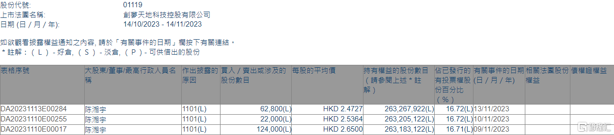 格隆汇11月14日丨根据联交所最新权益披露资料显示,2023年11月9日-11月13日,创梦天地(01119.HK)获董事会主席兼执行董事陈湘宇在场内以每股均价2.4727-2.65港元合计增持20.88万股,涉资约53.97万港元。