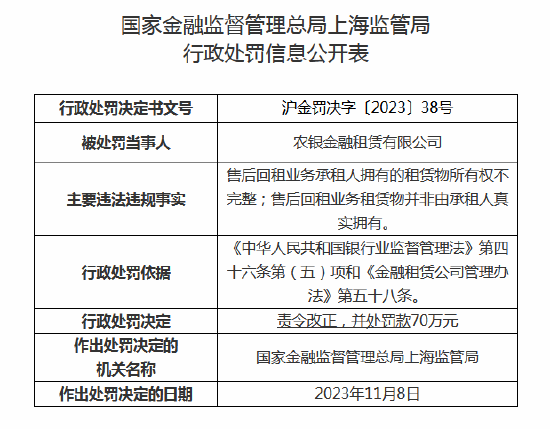 11月13日金融一线消息,国家金融监督管理总局网站发布的行政处罚信息公开表显示,农银金融租赁有限公司存在的违法违规事实包括:售后回租业务承租人拥有的租赁物所有权不完整、售后回租业务租赁物并非由承租人真实拥有。农银金融租赁被责令改正并罚款70万元,时任该公司基础设施业务部总经理王光被警告。