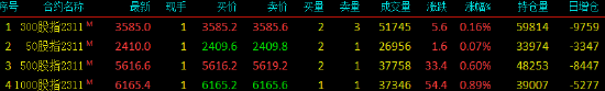 2023年11月14日,股指期货小幅上行,沪深300股指期货(IF)主力合约涨0.16%,上证50股指期货(IH)主力合约涨0.07%,中证500股指期货(IC)主力合约涨0.59%,中证1000股指期货(IM)主力合约涨0.89%。