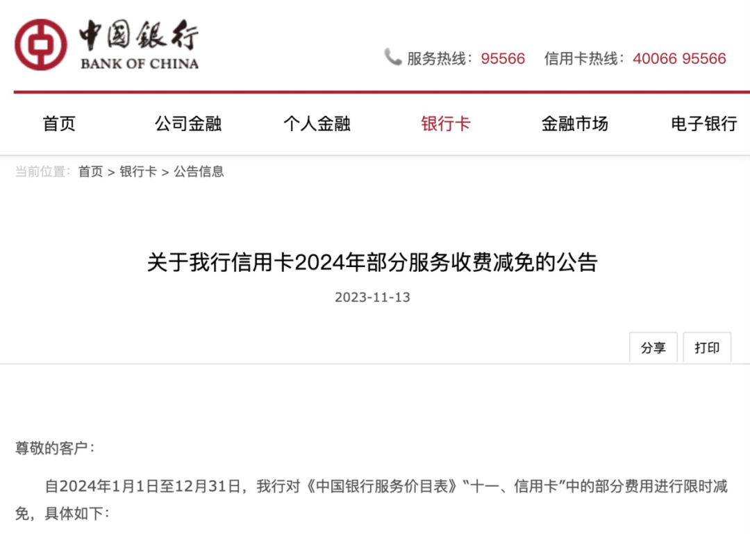 11月13日,中行发布《关于我行信用卡2024年部分服务收费减免的公告》,明确明年将对信用卡的部分费用进行限时减免。比如,暂免收取“结算服务”结算交易手续费中,中银系列产品持卡人使用自有资金进行柜台取现手续费;暂免收取“其他综合服务”查询及货币兑换手续费中,金卡及以上等级信用卡的跨境交易货币兑换费;暂免收取“其他综合服务”卡片综合服务费中,信用卡补发卡/损坏卡/提前换卡的服务费等。