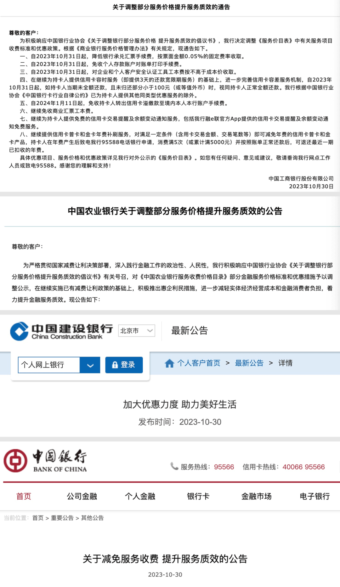 10月30日,工行、农行、中行、建行在相关公告中明确,为持卡人提供免费的信用卡交易提醒及余额变动通知服务;免收持卡人转出信用卡溢缴款至境内本人本行账户手续费,各大行的具体执行时间稍有区别。
