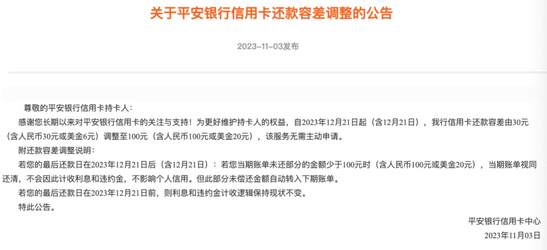 记者还注意到,在股份行中,平安银行也发布了《信用卡还款容差调整的公告》,明确自12月21日起(含12月21日),该行信用卡还款容差由30元(含人民币30元或美金6元)调整至100元(含人民币100元或美金20元),该服务无需主动申请。