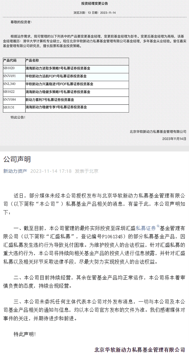 另外,据业内人士透露,华软新动力今日连发两则公告,其中一条公告提到,对旗下6只产品变更投资经理,高旸接任此前的基金经理彭冬,这6只产品分别是滴海新动力进取多策略1号私募证券投资基金、华软新动力远航FOF1号、华软新动力兴瀛稳进1号FOF、滴海新动力稳健多策略1号、新动力套利7号和滴海新动力稳健专享1号。另一条公告则提到,定于11月16日对华软新动力平衡价值1号临时开放,临时开放日仅接受赎回申请。