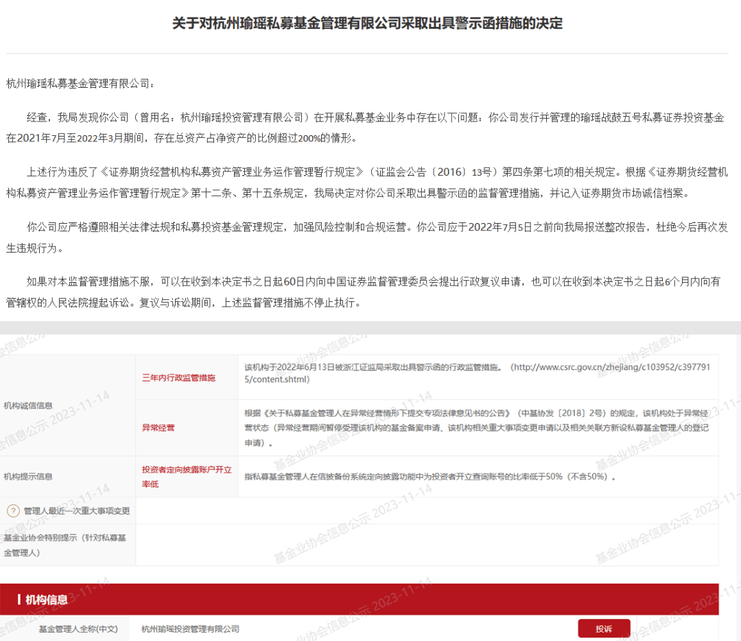 2022年6月13日,瑜瑶投资被浙江证监局出具警示函,处罚事由为公司旗下瑜瑶战鼓五号私募证券投资基金在2021年7月至2022年3月期间,存在总资产占净资产的比例超过200%的情形。时任公司法人何国清、基金投资经理杨泽斌也因此被出具监管函。