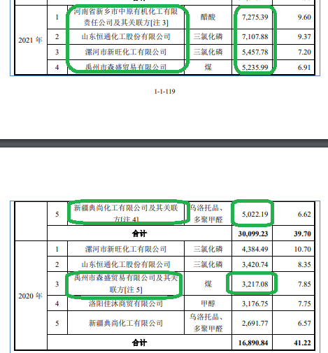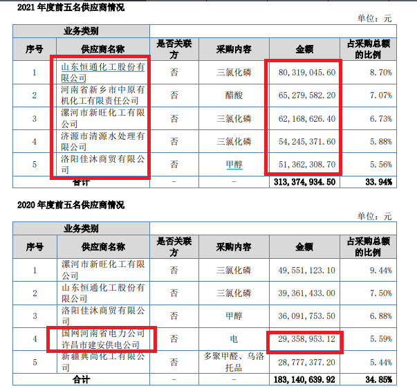 而在红东方2023年版本的招股书中,红东方2021年度前五大供应商分别为中原化工及其关联方、恒通化工、新旺化工、禹州市森盛贸易有限公司(森盛贸易)、新疆典尚化工有限公司及其关联方,交易金额分别为7275.39万元、7107.88万元、5457.78万元、5235.99万元、5022.19万元。