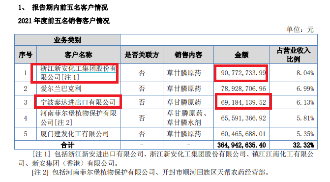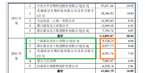 如果是统计口径造成的上述差异,红东方在2022年版本的公开转让说明书中称浙江新安化工集团股份有限公司、河南菲尔堡植物保护有限公司包括合并口径,那宁波泰达和芜湖诺信也应当包括合并口径。