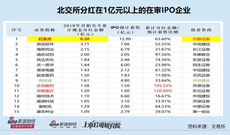 截至10月31日,北交所有107家在审拟IPO企业(以交易所受理为标准,不包含已终止企业及已发行企业,下同),其中91家在报告期内进行了现金分红,分红额超过1亿元的有15家,占比约14.02%;分红额超3亿元的有2家,分别是红东方(8.2亿元)、思迅软件(3.7亿元)。