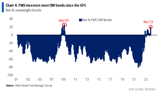 美国银行基金经理的最新调查显示,投资者对债券的看涨程度达到全球金融危机以来的最高水平,因为他们“坚信”利率将在2024年走低。