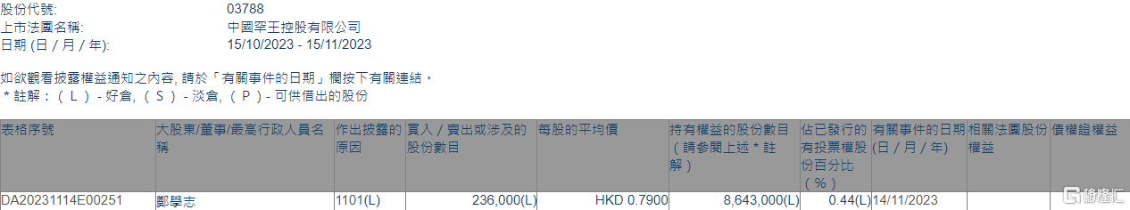 格隆汇11月15日丨根据联交所最新权益披露资料显示,2023年11月14日,中国罕王(03788.HK)获执行董事郑学志在场内以每股均价0.79港元增持23.6万股,涉资约18.64万港元。
