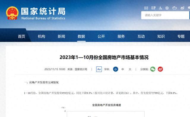 1—10月份,全国房地产开发投资95922亿元,同比下降9.3%(按可比口径计算,详见附注6);其中,住宅投资72799亿元,下降8.8%。