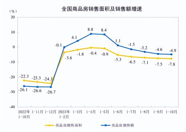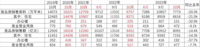 在商品房销售方面,1—10月份,商品房销售面积92579万平方米,同比下降7.8%,其中住宅销售面积下降6.8%。商品房销售额97161亿元,下降4.9%,其中住宅销售额下降3.7%。
