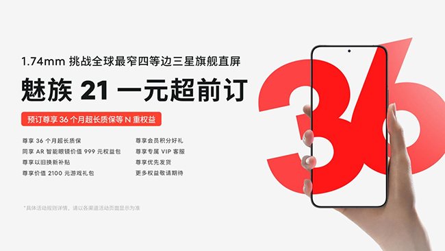 如果说 1.74mm 是魅族在产品设计和工艺上追求极致的成果展示,那么 36 个月超长质保就是魅族在品质和服务上追求极致的态度体现。随着魅族 21 一元超前订活动的开启,魅族再次为广大消费者带来 36 个月超长质保这一重磅服务。