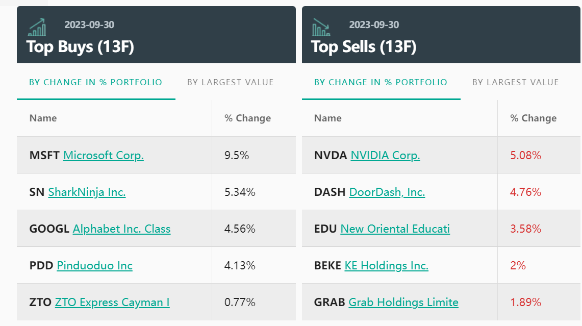 在几家私募中,唯有景林在第三季度展现出了对国内消费前景的信心:景林第三季度对拼多多进行了超45万股的加仓,使其持仓占比从15.7%提升至19.8%,仍保持其第一大持仓的地位。不过,景林也砍掉了将近一半的新东方仓位。
