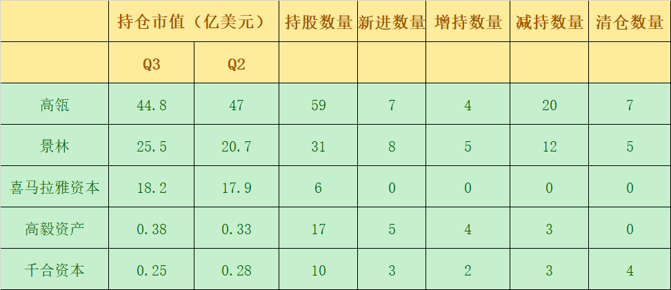 景林、高毅和千合资本均侧重于互联网消费和通信领域,其中景林和高毅的头号持仓均是拼多多,而千合资本则在第三季度大幅加仓百度、减持阿里巴巴,使得百度替代阿里巴巴成为其头号持仓。