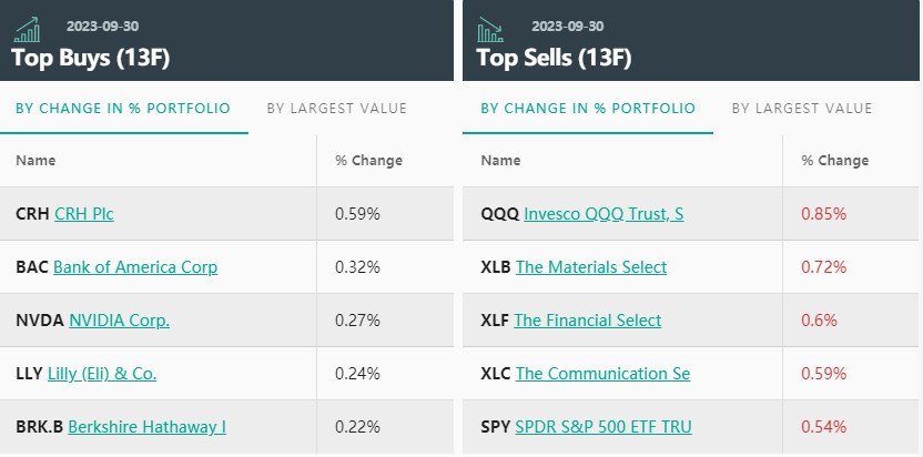 从持仓比例变化来看,分别是:CRH水泥(CRH.US)、美国银行(BAC.US)、英伟达、礼来(LLY.US)、伯克希尔-B。