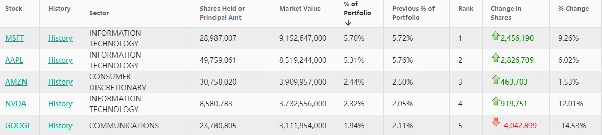 在中,微软(MSFT.US)位列第一,持仓约2899万股,持仓市值约91.53亿美元,较上季度持仓数量上升9.26%,占投资组合比例为5.70%。