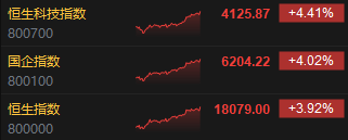 11月15日消息,香港下调印花税税率即将生效,且受美国通胀降温以及10月中国经济持续向好等影响,港股三大指数大涨,截至收盘,恒生指数涨3.92%,报18079点,恒生科技指数涨4.41%,国企指数涨4.02%。盘面上,核心科技股集体上涨,京东涨超6%,小米、阿里巴巴涨超5%,腾讯、美团、百度涨超4%;内房股普涨,融创中国涨超10%;汽车股全天强势,小鹏汽车涨超7%;手机产业链涨幅居前,丘钛科技涨近8%,舜宇光学科技涨超6%;黄金股齐涨,紫金矿业涨超5%;光伏股全线上扬,信义光能涨超9%;医药外包概念股上涨,药明生物涨超6%;医药B类股逆势下挫,康宁杰瑞制药-B跌超33%;房地产信托、手游、锂业股等涨势活跃。