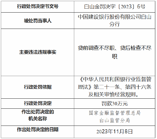 11月15日金融一线消息,国家金融监督管理总局白山监管分局行政处罚信息公开表显示,中国建设银行股份有限公司白山分行因贷前调查不尽职、贷后检查不尽职,被罚款30万元。