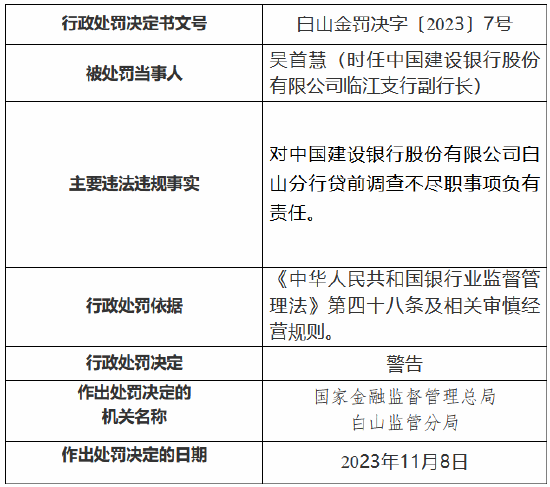 时任中国建设银行股份有限公司临江支行副行长的吴首慧,对分行贷前调查不尽职事项负有责任,受到警告。