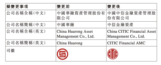 11月15日,中国华融资产管理股份有限公司发布公告称,根据该公司整体战略规划及定位,为进一步提升品牌影响力,公司名字将由“中国华融资产管理股份有限公司”变更为“中国中信金融资产管理股份有限公司”,简称由“中国华融”变更为“中信金融资产”,并变更了司徽。