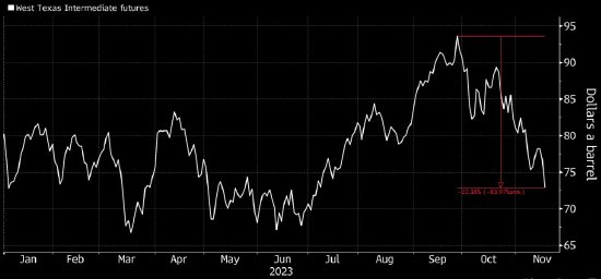WTI原油期货在每桶73美元附近,此前较9月高点下跌逾20%。布伦特原油周四暴跌近5%。原油下跌发生在美国原油库存增加之后,并可能被自动抛售程序放大。