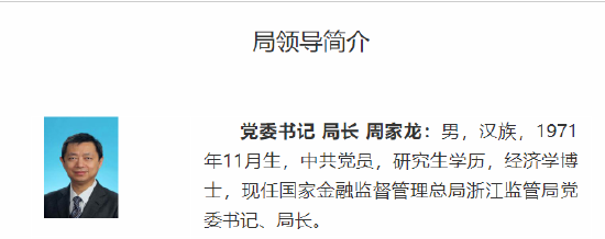 11月17日金融一线消息,国家金融监督管理总局浙江监管局官网已更新领导名单,周家龙出任国家金融监督管理总局浙江监管局党委书记、局长。