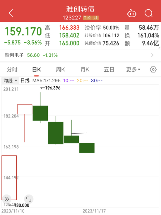 比如11月10日上市的雅创转债,在前两个交易日分别大涨57.3%和20%后,第三个交易日再度冲高到最高196.396元后,就开始持续回落,目前最新价格已经跌至159.17元,高位下来跌幅近20%。