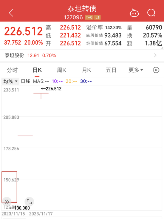 实际上,不只是当天上市的三羊转债,此前几天上市的泰坦转债还在继续20CM涨停,泰坦转债在11月15日首日上市57.3%涨停后,昨日20%一字涨停,今天继续20%涨停。价格已经达到226.512元,三天暴涨126.512%。连续暴涨该转债的转股溢价率高达142.3%。