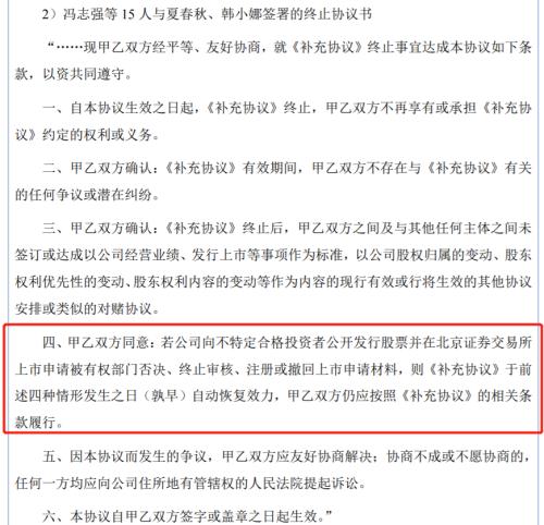 然而,终止协议中均包含一条引人关注的条款:“若公司向不特定合格投资者公开发行股票并在北交所上市申请被有权部门否决、终止审核、注册或撤回上市申请材料,则《补充协议》于前述四种情形发生之日(孰早)自动恢复效力,双方仍应按照《补充协议》的相关条款履行”。