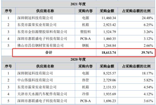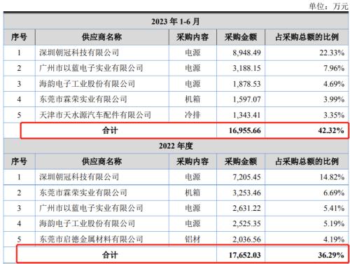 报告期内,公司向前五大供应商采购原材料及成品的金额分别为1.7亿元、1.86亿元、1.77亿元和1.7亿元,占采购总额的比例分别为36.27%、39.76%、36.29%和42.32%,采购内容包括电源、机箱、铝材、钢材等。