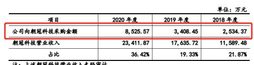 早在2018年和2019年,朝冠科技就成为公司第一大供应商,同期公司向其采购金额分别为2534.37万元和3408.45万元。