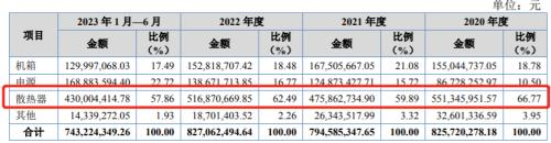 招股书显示,九州风神的主营业务收入来源于销售散热器、机箱、电源等产品。2020年-2023年上半年(以下简称“报告期”),九州风神的散热器销售收入分别为5.51亿元、4.76亿元、5.17亿元和4.3亿元,占主营业务收入比例分别为66.77%、59.89%、62.49%和57.86%。