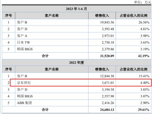 2020年-2022年,北京京东世纪贸易有限公司(招股书称“京东世纪”,即众所周知的电商平台“京东”)为公司第二大客户,其销售金额分别为6587.01万元、5310.08万元和3671.01万元,占当期营业收入的比例分别为7.94%、6.64%、4.4%。