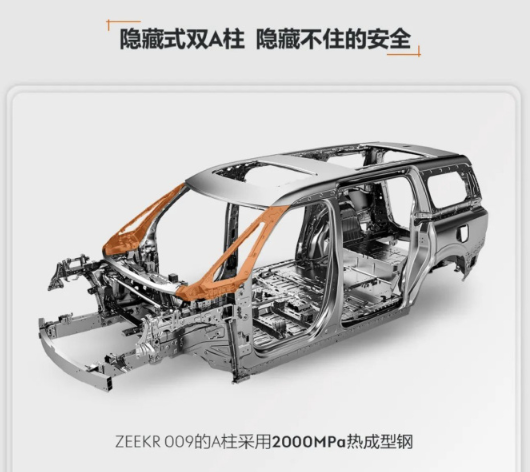 不过就目前来看,用于衡量安全性的 A 柱的屈服强度,理想还没有放出更多信息。你就看隔壁极氪 009 吧,A柱能割开板车尾部的钢板,就因为它的双 A 柱均采用了屈服强度高达2000Mpa的热成型钢。