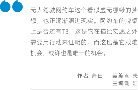 科技改变未来,无人驾驶网约车这个看似虚无缥缈的梦想,也正逐渐照进现实。未来,网约车的牌桌上,是否还有T3,这是它在描绘宏愿之外需要用行动来证明的。而这也是它艰难机会,或许也是唯一的机会。